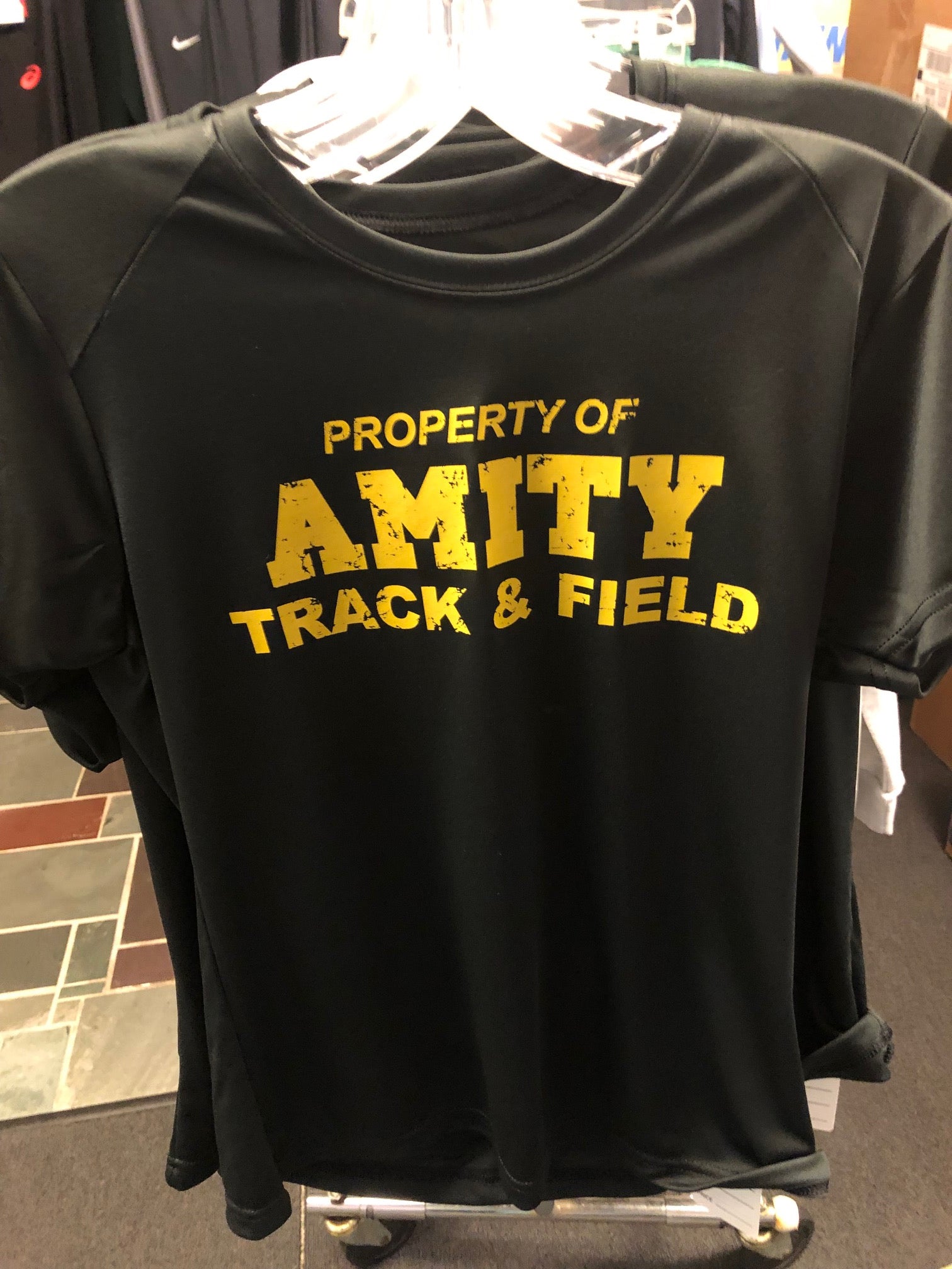 Black A4 Women's short sleeve tech tee printed full front Gold "Property of Amity Track & Field"